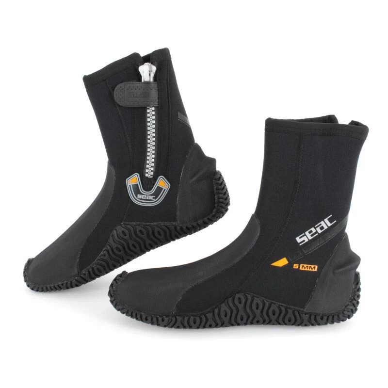 Bottillon de 5 mm pour la plongée avec semelle semi-rigide, protection PU sur le cou-de-pied, cran pour une sangle de palme au niveau du talon, et doublure en Nylon standard.