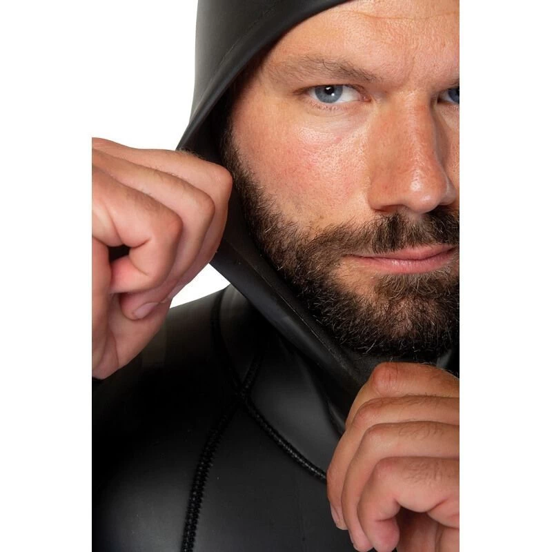 La combinaison présente un panneau sous les aisselles pour améliorer le confort et le port. La conception est rigoureusement anatomique. Renforts de protection sur la poitrine, les genoux et l’entrejambes. Joints étanches en néoprène lisse sur la capuche, les poignets et les chevilles.