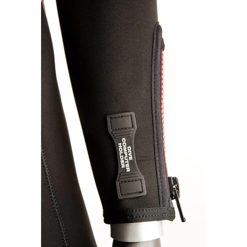 Sur les poignets et aux chevilles nous utilisons un système Aquastop avec double manchon en néoprène et fermeture.