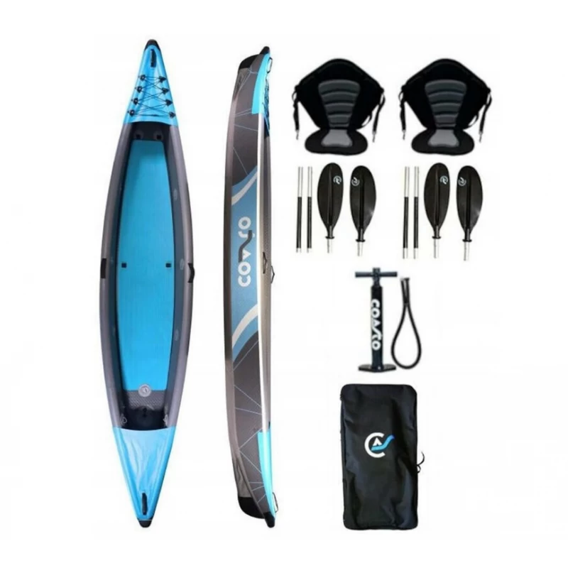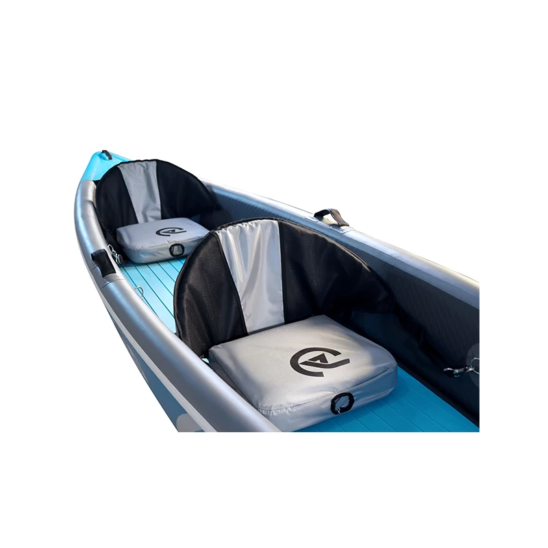 Le modèle 2 places a une charge maximale de 200kg, il est livré avec deux pagaies en 4 parties avec double pale, deux sièges confort en Dropstitch et néoprène, une pompe double action et un sac de transport à roulettes.