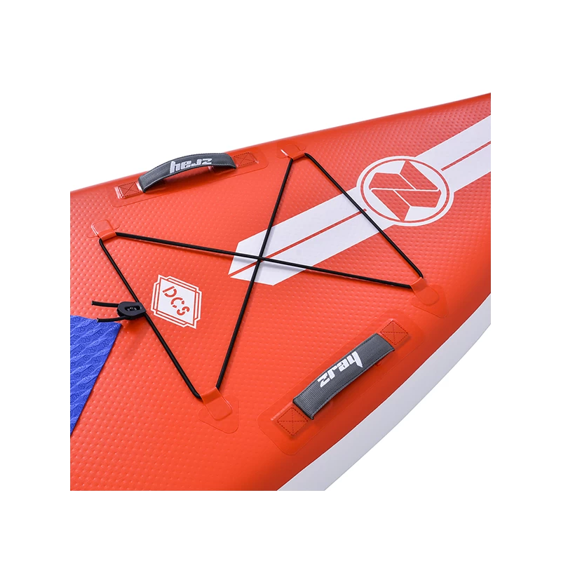 Zray opte pour positionner des poignées en néoprène à l’avant et au centre du paddle pour faciliter son transport une fois le SUP gonflé.