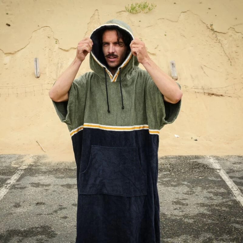 Pouvoir se changer sur le parking sans montrer ses fesses ou être tout nu sous son poncho reste pour nombre de surfeur un défi, ce poncho surf va vous permettre de le relever. Un large poncho à capuche en éponge qui s’enfile comme un pull et sous lequel vous pourrez vous changer ou rester à déambuler sur le spot.